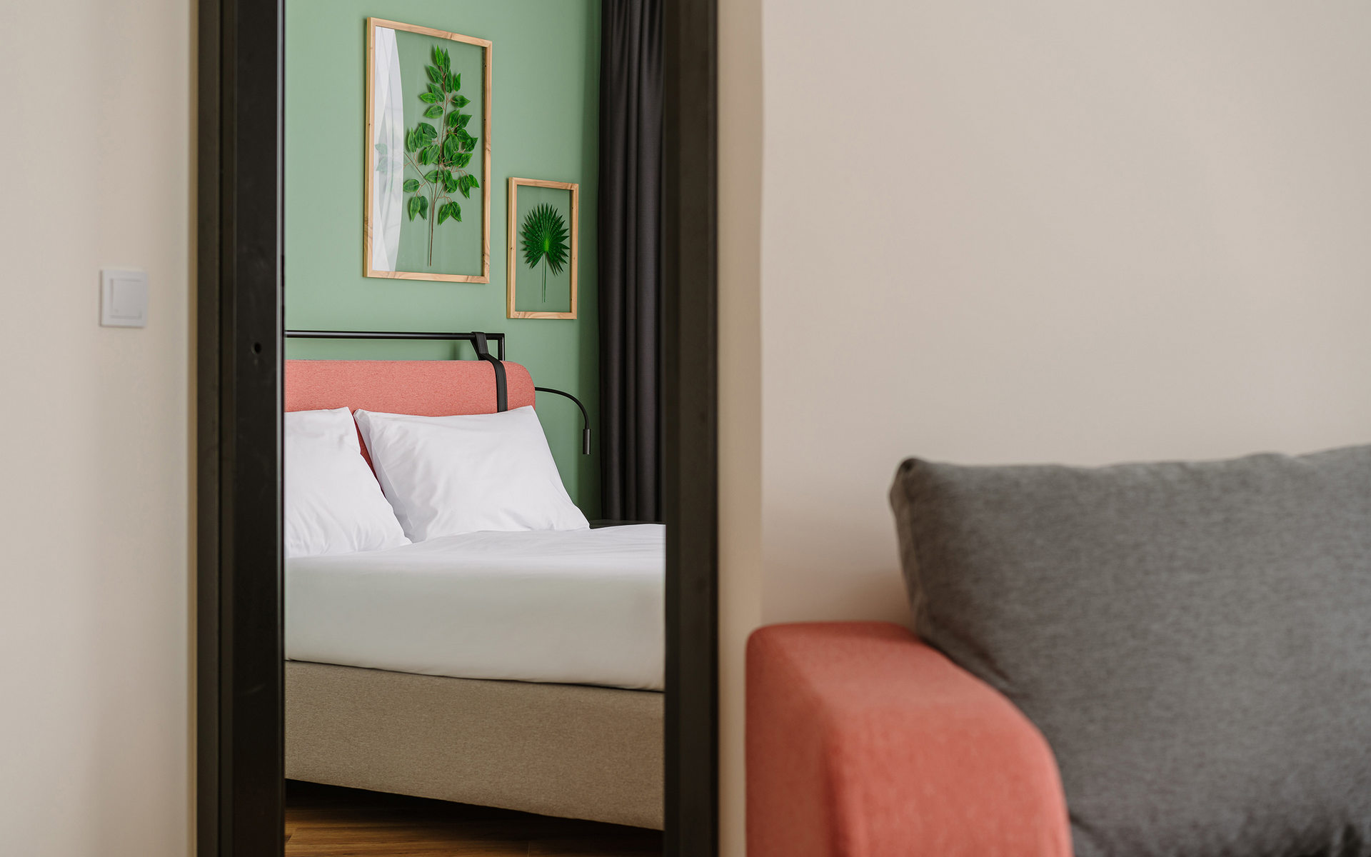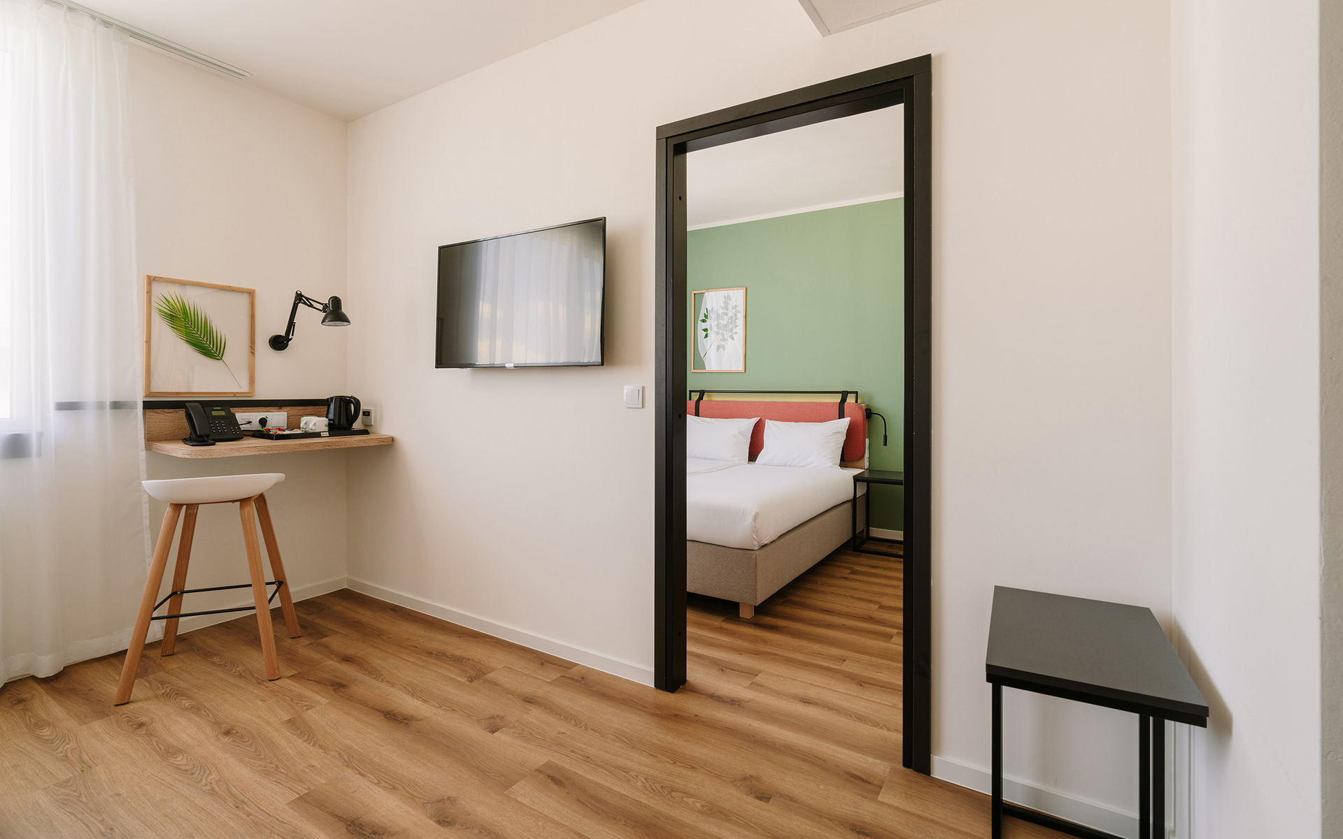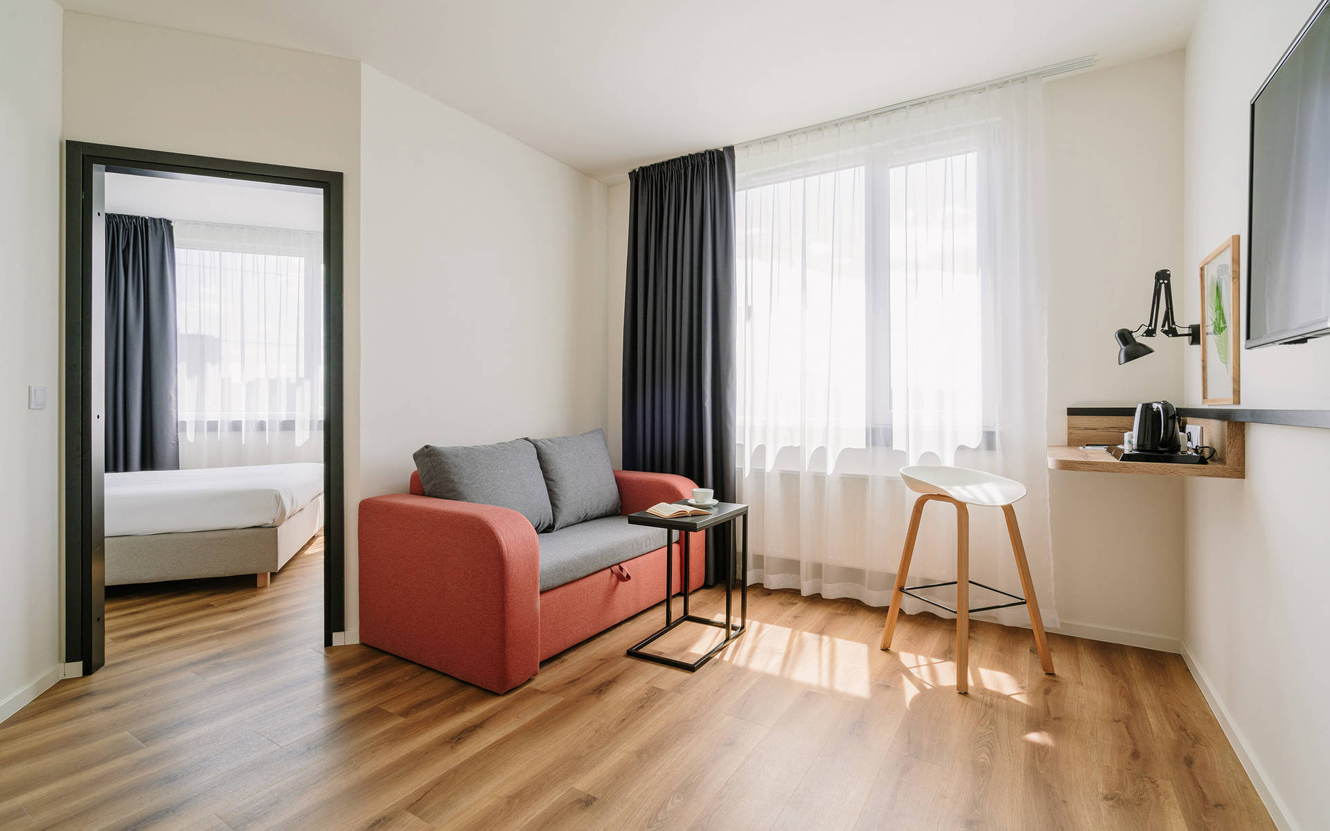Apartament rodzinny Lux oferuje komfort i prywatność dzięki oddzielnej sypialni z łóżkiem podwójnym oraz rozkładanej kanapie w części dziennej, która może służyć jako dodatkowe miejsce do spania.